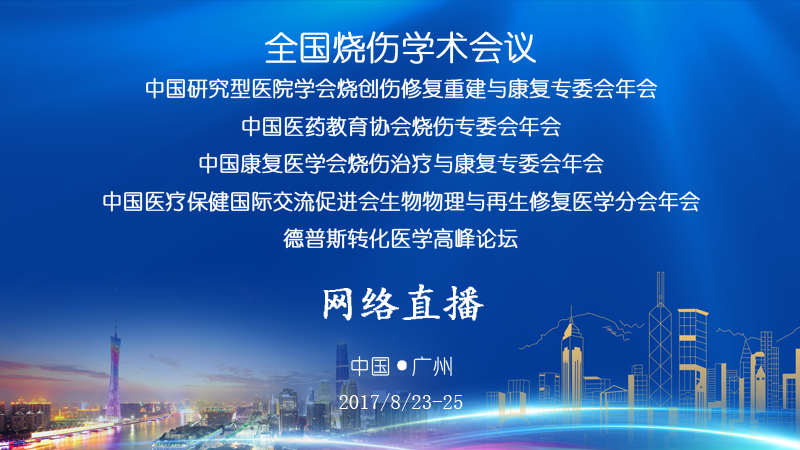 【网络直播】“全国烧伤学术会议、中国研究型医院学会烧创伤修复重建与康复专委会年会、中国医药教育协会烧伤专委会年会、中国康复医学会烧伤治疗与康复专委会年会、中国医疗保健国际交流促进会生物物理与再生修复医学分会年会、德普斯转化医学高峰论坛”于2017年8月23-25日在广州·白云国际会议中心召开,本次会议由广州高通影像技术有限公司提供专业网络直播服务!