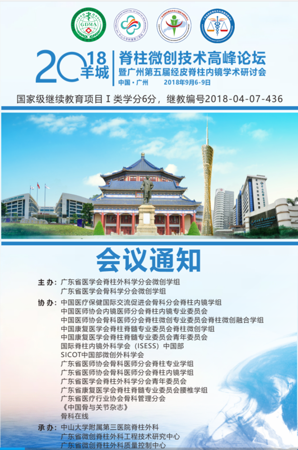 转播预告|“2018脊柱微创技术高峰论坛暨广州第五届经皮脊柱内镜学术研讨会”于2018年9月6-9日在中国·广州召开,本次会议由广州高通影像技术有限公司提供专业手术转播服务!敬请期待!
