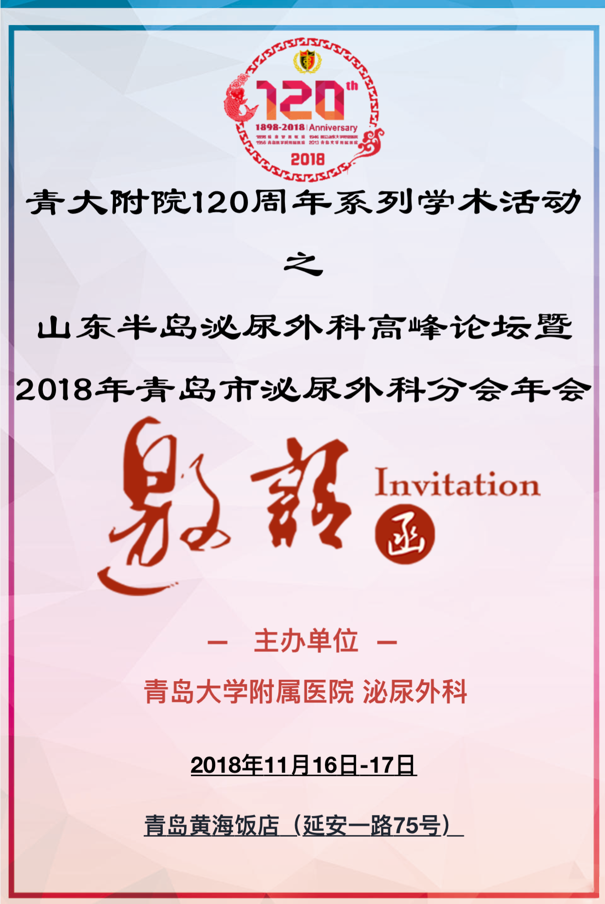 转播预告|“青大附院120周年系列学术活动之山东半岛泌尿外科高峰论坛暨2018青岛市泌尿外科分会会议”于2018年11月16-17日在中国·青岛召开,本次会议由广州高通影像技术有限公司提供专业手术转播服务!敬请期待!